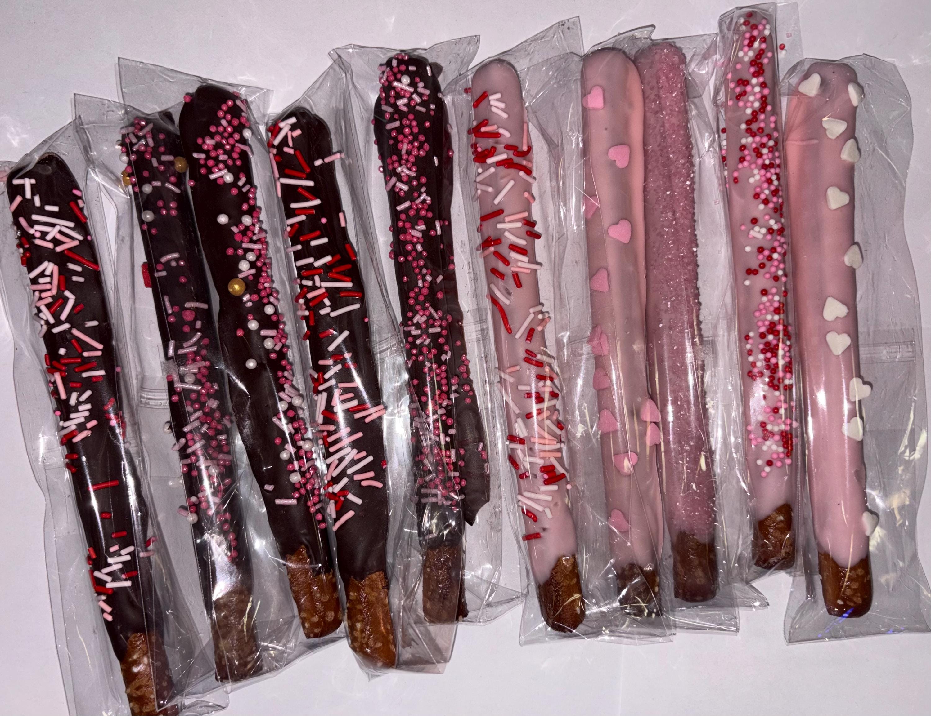 Custom chocolate or white chocolate dipped pretzel rod bundles for all occasions! Birthdays, baby showers, anniversaries, gender reveals, holidays, and much more!